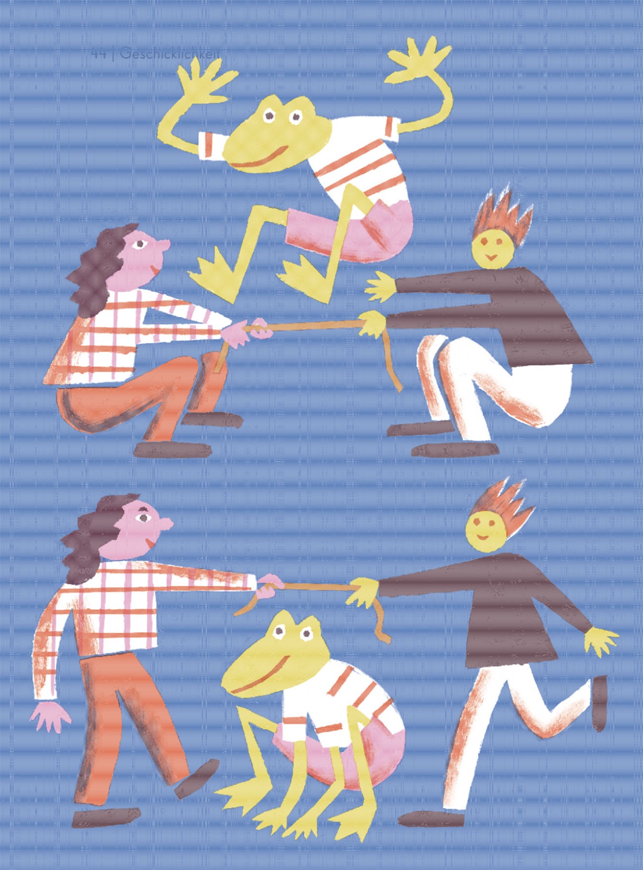 «Muskelsalat», das von der vielfach ausgezeichneten Illustratorin Katrin Stangl eindrucks- und fantasievoll gestaltete Buch, versammelt Rauf-, Rangel- und Tobespiele von «Zerrenziehen» über «Hahnenkampf» bis hin zu «Wäscheklammerklau», «Affenjagd» und «Wettspringen der Frösche» – Aktivitäten, in deren Mittelpunkt immer die Freude an der Bewegung steht! Alle Spiele wollen Kinder weg vom Bildschirm locken – wissend, dass ein Hinterhof und ein paar einfache Ideen dafür ausreichen. Auf die Spiele, fertig, los …